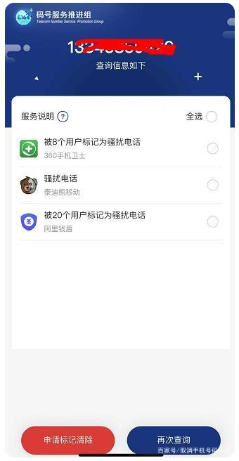 可以查询到自己的手机号被哪些平台标记了,这样再针对每个平台一一取消就可以正常使用了。号码取消成功之后,会有短信通知。
